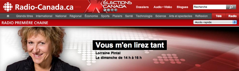 Vous m’en lirez tant 24 avril 20113 mars 2015 ~ Eric Plamondon Auteur Vous m’en lirez tant, Radio-Canada, 24 avril 2011 par Lorraine Pintal. Partager : Partager sur X(ouvre dans une nouvelle fenêtre) X Partager sur Facebook(ouvre dans une nouvelle fenêtre) Facebook J’aime chargement… Articles similaires