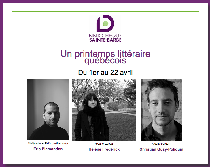 Du 1er au 22 avril, la bibliothèque Sainte-Barbe, en collaboration avec la Bibliothèque Gaston Miron (Paris 3) et l’association Cousins de personne, vous invite à découvrir la littérature québécoise contemporaine à travers une série de rencontres avec des auteurs québécois, tous les mercredis à 19h30. Chacune de ces rencontres sera illustrée par des lectures de textes des auteurs invités : Eric Plamondon, Hélène Frédérick et Christian Guay-Poliquin.