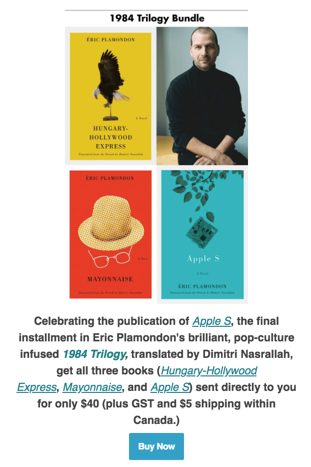 1984 Trilogy Bundle 28 juin 202028 juin 2020 ~ Eric Plamondon Auteur La Trilogie 1984 d’Eric Plamondon, traduite par Dimitri Nasrallah, disponible en trois volumes chez Véhicule Press : Hungary-Hollywood Express, Mayonnaise, Apple S. http://www.vehiculepress.com/q.php?EAN=1606202001 Partager : Cliquer pour partager sur X(ouvre dans une nouvelle fenêtre) X Cliquez pour partager sur Facebook(ouvre dans une nouvelle fenêtre) Facebook J’aime chargement… Articles similaires